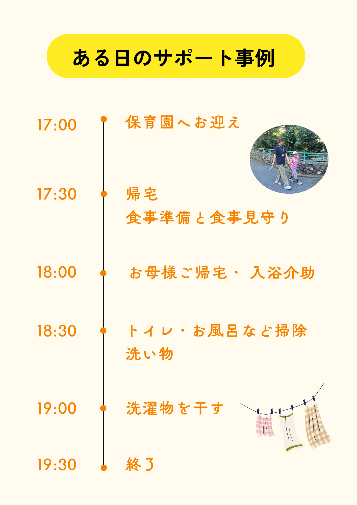 内容は、保育園の送迎や帰宅後の見守り、掃除や洗濯物を干すこと、夜ごはん作り、入浴のサポートなど。